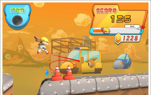 當(dāng)你看到紅彤彤的路障時(shí),很開(kāi)心,以為能夠像踩怪獸一樣踩在它身上然后跨越,那就等著被插死吧,遇到紅色路障時(shí)一定要跨越才能通過(guò)。