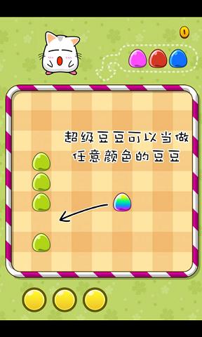 將5個以上相同顏色的豆豆連在一起(橫豎斜方向)即可打擊小怪物,連續(xù)打擊(Combo)得分將翻倍,彩色的超級豆可以替代任何顏色的豆豆。