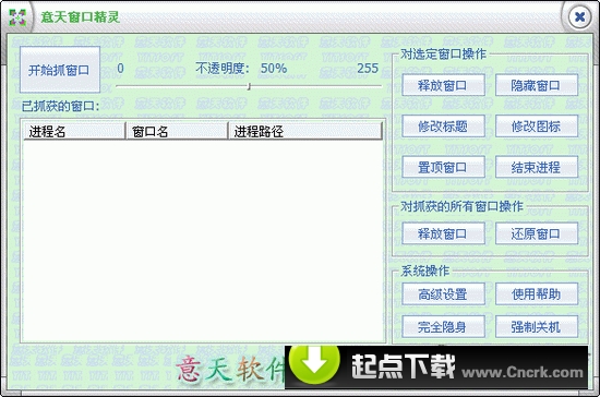 意天隱藏窗口精靈是一款Windows操作系統(tǒng)下的窗口管理工具,其程序精小而功能強大。它可抓住任何可視窗口,并對其進行:透明處理、半透明處理、完全隱藏、修改窗口標題、 修改窗口圖標、置頂窗口等操作,并可殺掉窗口所屬的進程。