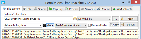 設(shè)置完畢以后,點擊「Reset」,這時會彈出一個框,里面有你設(shè)置的概況,確認無誤后點擊「Reset」即可設(shè)置,同時在主界面下方的日志欄中也會給出對應(yīng)的操作概況。點擊主界面右側(cè)的「Default」可以還原文件夾原來的權(quán)限。