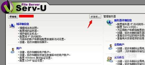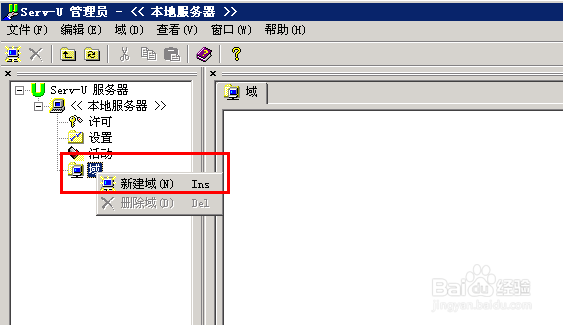 2.展開Serv-U服務(wù)器,找到“域”,如果已經(jīng)建立有域,可跳到建立用戶;如果沒有“域”則新建一個域.如下圖