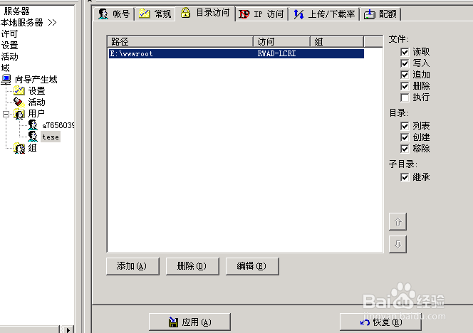 12. 為這個用戶分配訪問FTP的權(quán)限,可根據(jù)情況分配讀寫權(quán),但一定不能分配“執(zhí)行權(quán)”,不然會很危險.最后選擇“應(yīng)用”.