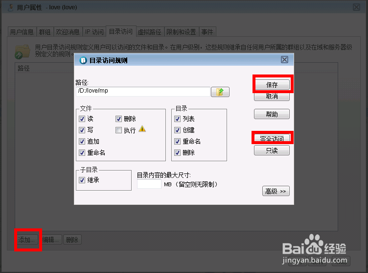 點擊添加按鈕選中D:\love\mp路徑。點擊完全訪問后單擊保存按鈕。如下圖: