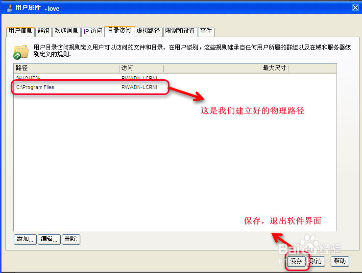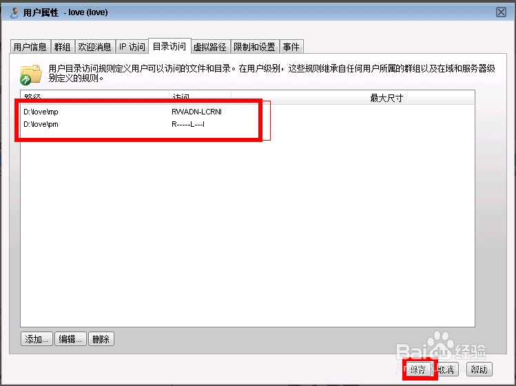 點擊保存按鈕。至此D:\love\mp(上傳)和D:\love\pm(下載)目錄權(quán)限部署完畢。