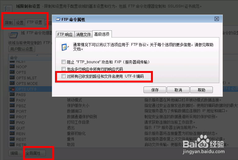 點擊全局屬性—〉高級選項 取消 對所有已發(fā)送的路徑和文件名使用UTF-8編碼 的勾選。