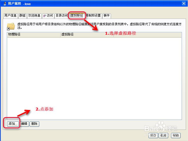 點編輯后,會出現(xiàn)用戶信息對話框,選擇虛擬目錄,然后點添加,如下圖所示: