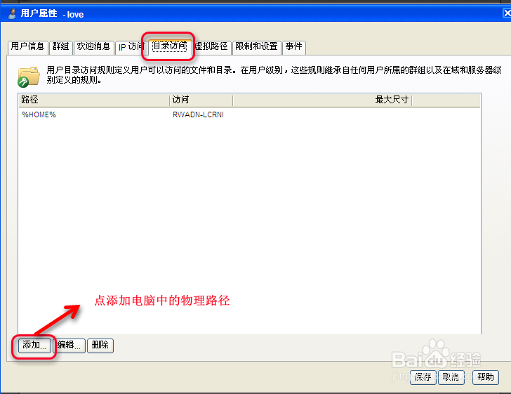 點保存后,會顯示你建立的路徑和目錄,然后返到目錄訪問,點添加按鈕添加物理路徑,如下圖所示: