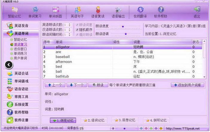 大嘴英語精選了英語900句、電話英語、商務英語、文秘英語、求職英語、出差旅游英語、社交英語、天天口語等九大類共9000多句常用英語對話和情景對話內(nèi)容以及小學英語詞匯、初中英語詞匯、高中英語詞匯、大學英語詞匯、自考英語詞匯、計算機英語詞匯、新概念英語詞匯、研究生英語詞匯、托福英語詞匯、外貿(mào)英語詞匯、商務英語詞匯、醫(yī)學英語詞匯、職稱英語詞匯等80000多個單詞的全部內(nèi)容并以可愛的卡通人物,運用先進的英語語音朗讀技術(shù),富于娛樂性;使您在使用電腦進行工作、學習或娛樂的同時,就能不知不覺、輕輕松松地掌握各類日常英語會話及常用英文單詞。該方式既擺脫了枯燥的傳統(tǒng)學習方法,又充分利用了在電腦前的各種冗余和等待時間,有效地提高了學習效率,在不知不覺中輕輕松松、迅速提高英語的聽力、口語水平及單詞數(shù)量。