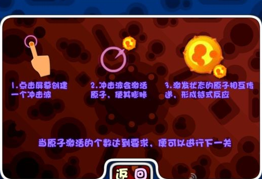 《鏈?zhǔn)椒磻?yīng)》是一款輕松有趣的休閑類游戲。手指點(diǎn)擊屏幕創(chuàng)建一個(gè)沖擊波觸發(fā)連鎖反應(yīng)~每一種原子被觸發(fā)了之后都會(huì)有不同的反應(yīng)。成片的原子相互爆破傳遞。玩家需要激活點(diǎn)目標(biāo)個(gè)數(shù)的原子便可進(jìn)行下一關(guān)。游戲有解謎模式和正常模式兩種游戲模式,考驗(yàn)玩家們的運(yùn)氣,技術(shù),耐心。一共有100余個(gè)關(guān)卡,占用時(shí)間不長,沒有體力限制,隨時(shí)隨地想玩就玩~【游戲特點(diǎn)】