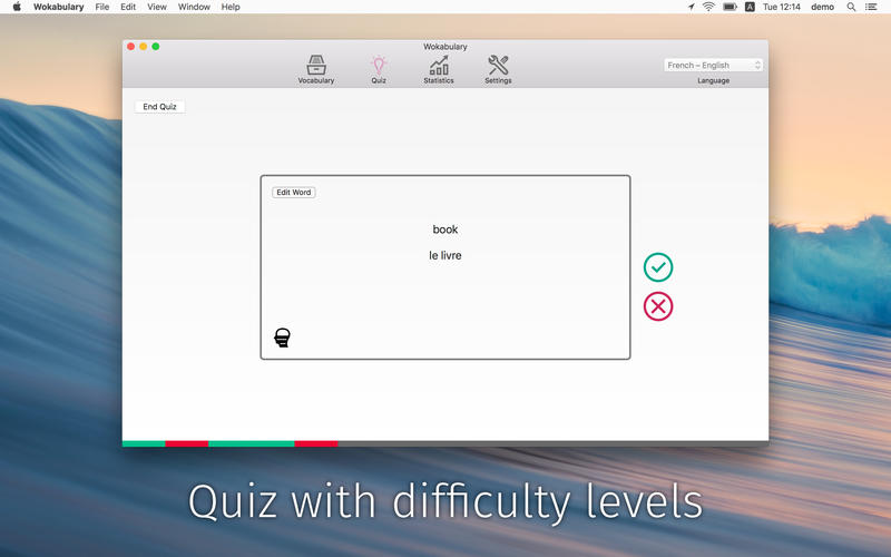 【1】Wokabulary是學(xué)習(xí)和排練的話新的,有趣和有效的方法。【2】就像閃存卡系統(tǒng),你在學(xué)校有,Wokabulary組織你的話在不同的存儲(chǔ)級(jí)別。這使得它很容易看到它的話,你已經(jīng)知道了,還有哪些需要重新排練。