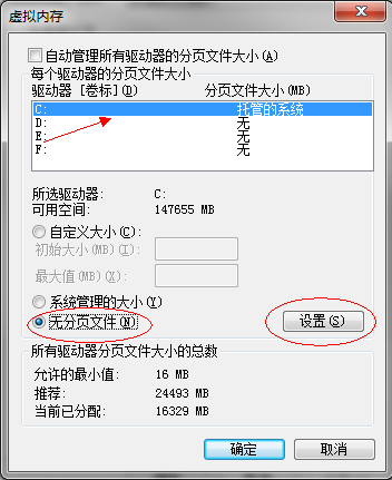 5、點(diǎn)選C盤后點(diǎn)擊“無分頁文件”并點(diǎn)擊設(shè)置。(此時(shí)C盤中的虛擬內(nèi)存就消失了)