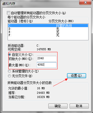 4、在“自定義大小”中調(diào)整虛擬內(nèi)存為您實(shí)際內(nèi)存的1.5倍到2倍。點(diǎn)擊設(shè)置重啟電腦即可。