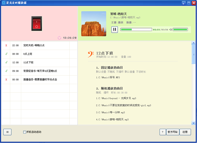 夏克定時(shí)播放器智能播放,時(shí)間精確,使用方便,支持無限播放列表,是目前市場(chǎng)上最簡單適用的一款專業(yè)級(jí)定時(shí)音樂播放軟件。
