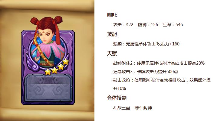 又一位中國神話中的小將來到了游戲中,關(guān)于哪吒各種翻江倒海、撥皮抽筋的頑劣事跡這里不再贅述了。首先,初始技能攻擊力增加雖然高達(dá)160點(diǎn),但畢竟是個(gè)單體技能??磥碓凇侗娚裰狻分?,三太子也依然擺脫不了被孫悟空壓制的命運(yùn),唯一的亮點(diǎn)是后面的合體技能仙封神,可以對橫排敵人造成釋放英雄總攻擊力5%+2000點(diǎn)的傷害。