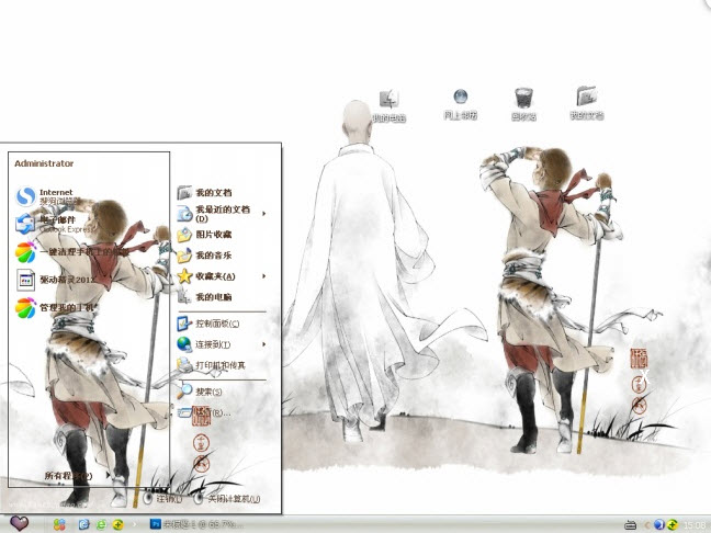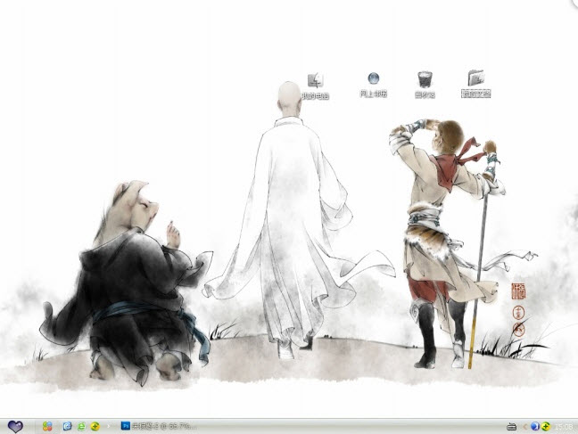 這款水墨畫風(fēng)電腦主題xp版主題是取材于一幅水墨風(fēng)景畫,畫中我們可以看到大家熟悉的孫悟空和唐僧師徒。唐僧穿著白色僧服正在大步向前,多了幾分瀟灑,而齊天大圣正拿著金箍棒眺望遠(yuǎn)方,盡職盡責(zé)地保護(hù)著師父的安全,而旁邊胖墩墩的豬八戒還是那么憨厚自顧自各地走著……