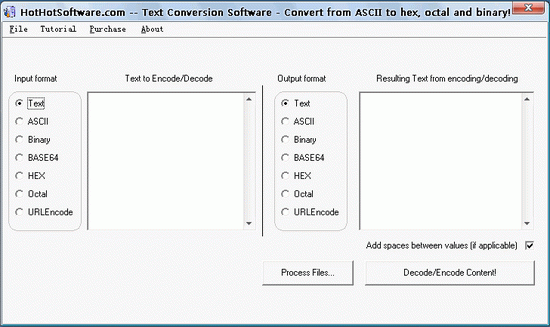 Text Conversion Software PRO是一個是非常好用的文字轉換軟件。它允許你輕易地將文本在十六進制、二進制、ASCII、BASE64、HEX、Octal、URLEncode之間相互轉換! 此外,您可以直接進行多個文件的批處理轉換,可以通過指定一個文件擴展名批量添加文件,或者干脆輸入一些文字到一個文本框并轉換