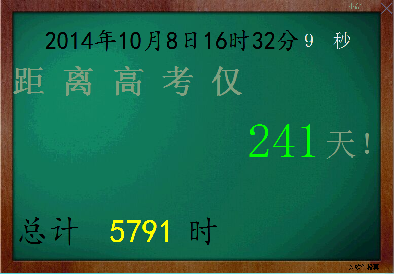 1.點擊“秒”字可打開鬧鐘2.無論是大窗口還是小窗口,只需左鍵點擊剩余的天數(shù)即可嵌入桌面(注:嵌入桌面是指置于最底下且無法移動) 再用右鍵點擊剩余天數(shù)就能再次移動了