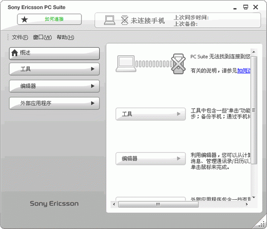Sony Ericsson PC Suite是一套免費軟件,用來增強Sony Ericsson 移動電話的功能,包括下列軟件程序:文件管理器,圖像編輯器,Sony Ericsson MMS Home Studio,移動網(wǎng)絡(luò)向?qū)?同步站..