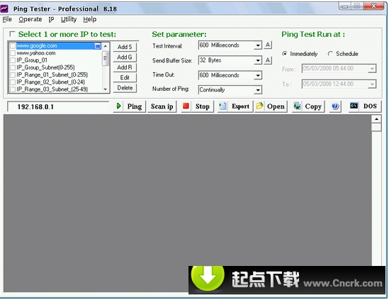 Ping Tester Pro是一款可視化的網(wǎng)絡(luò)Ping工具。它提供了很多選項(xiàng),包括Ping時(shí)間間隔、緩沖塊大小已經(jīng)Ping次數(shù)等,還可以計(jì)劃Ping的運(yùn)行時(shí)間。支持的特性有:對(duì)一個(gè)IP多一組IP進(jìn)行Ping操作;快速掃描一組IP;在Windows窗口中運(yùn)行DOS命令;可在計(jì)劃的時(shí)間自動(dòng)運(yùn)行Ping操作;輸出報(bào)告以分析;支持將結(jié)果導(dǎo)出問(wèn)txt文件或excel表格