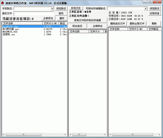 很方便很快捷的把你電腦上的MP3、MP4文件拷貝到你的MP3、手機、Mp4等可移動設(shè)備上,你也可以在你的硬盤之間相互拷貝