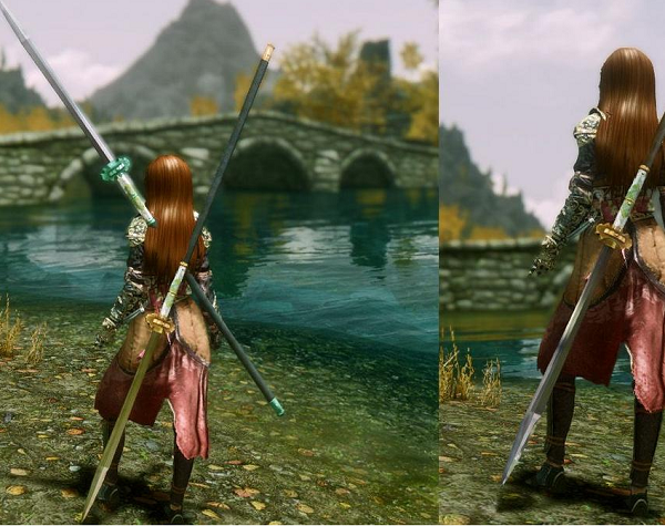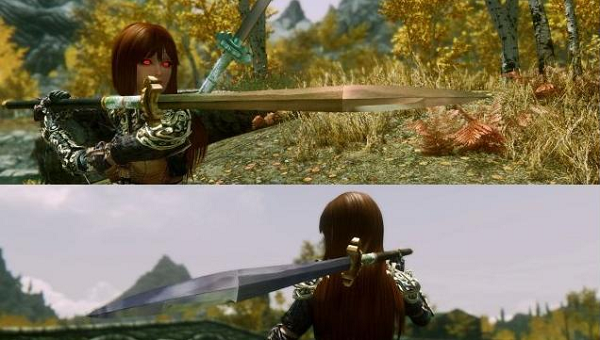 【東君】綁定方式為雙手劍,黃金打造,白銀為輔(劍鞘),柄為蛟皮卷,劍身可見花紋鋼肌理,自帶破曉者附魔。如此設(shè)定是因為最初[東君]的介紹是這樣的:東君就是太陽神,全刀以黃金所鑄,芒如烈日,光芒四射,劈出的刀罡也是烈熱如火。