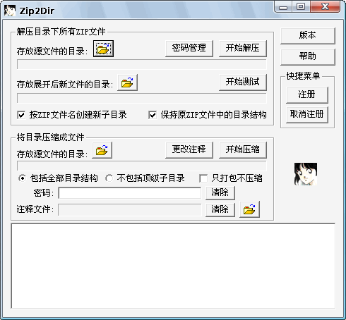 Zip2Dir是一款電子版漫畫整理工具,能夠批量壓縮/解壓/測試/注釋ZIP文件,支持右健菜單,具有密碼記憶功能。