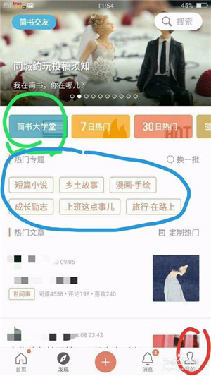 3、進(jìn)入到首頁后的頁面,可以看到:“簡書大學(xué)堂”,可以在這里面學(xué)習(xí)一些如何寫作的知識,作為一名新手作者,還是建議大家先從學(xué)習(xí)開始吧(綠色標(biāo)注)。要么會有一種無從下手的感覺呢!并且還可以關(guān)注一下熱門專題,看自己個人興趣了,旅游類,讀書累,寫作類,漫畫手繪類,很多專題,都可以先關(guān)注瀏覽一下,這也為自己今后要在那個專題類下面投稿文章做前期的準(zhǔn)備功課啦!比如下圖(藍(lán)色標(biāo)注)和右下角有“我的”鍵點(diǎn)擊可以進(jìn)入自己的主頁面(紅色標(biāo)注)。