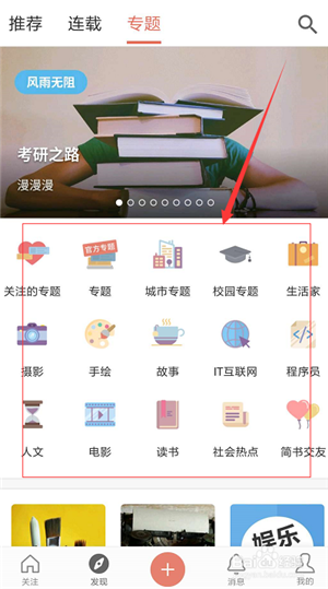 2、在發(fā)現(xiàn)板塊中有專題欄目,包含城市專題、校園專題、生活專題等,是一個比較細(xì)致的分類。