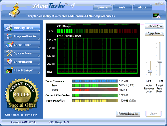 MemTurbo 通過以下四個主要功能來提升你的系統(tǒng)性能: 整理你的物理內(nèi)存碎片通過整理物理內(nèi)存碎片, 你的虛擬內(nèi)存構(gòu)成將與物理內(nèi)存構(gòu)成更加接近. 這會增加你的存儲器高速緩存命中率和優(yōu)化數(shù)據(jù)的局部性引用, 從而提升位于處理器或者主板上的 L1 和 L2 高速緩存效率. 增加可用的內(nèi)存 MemTurbo 嘗試從操作系統(tǒng)和程序中回收內(nèi)存, 以便在你當前使用程序需要內(nèi)存時, 輕易得到足夠的可用內(nèi)存. 這避免了交換文件訪問和頁面調(diào)度的性能消耗, 減少載入時間和增進了程序性能. 回收內(nèi)存遺漏通過回收操作系統(tǒng)和劣質(zhì)程序保留和遺忘的內(nèi)存, MemTurbo 可以同時增加可用的物理內(nèi)存和虛擬內(nèi)存數(shù). 轉(zhuǎn)儲未使用的庫和 DLL 很多程序和一些操作系統(tǒng)會載入一些不常使用的或者根本不用的庫. 為優(yōu)化性能, MemTurbo 安全地從內(nèi)存中轉(zhuǎn)儲清出這些 DLL 和庫到系統(tǒng)頁面文件中, 空出它們所用的內(nèi)存空間. 當需要時, 它們又會立即透明地載回到內(nèi)存中.