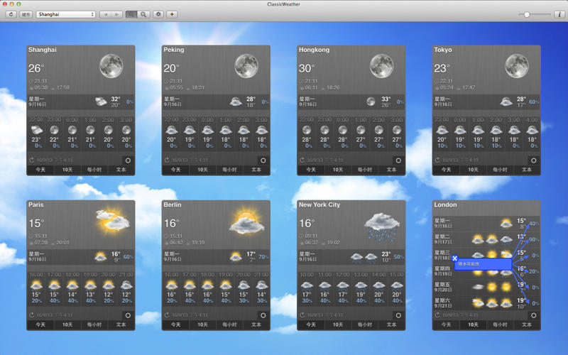 ClassicWeather在mac平臺(tái)上是非常好用的一款天氣查詢的軟件,這款軟件的界面非常漂亮,給人一種很清新自然的感覺,軟件界面有兩種溫度單位顯示,可以顯示世界各地的天氣,使有打算出國(guó)旅行的朋友們可以更好的準(zhǔn)備好應(yīng)該帶的服裝或者雨具,不用再被突然惡化的天氣困擾了。