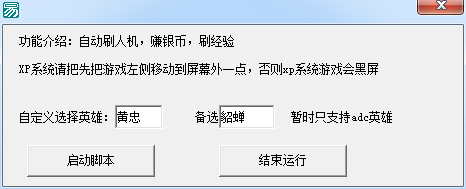 英雄三國(guó)霸主輔助是一款輔助工具。該輔助可以幫助玩家自動(dòng)掛機(jī),還有賺銀幣和自動(dòng)刷經(jīng)驗(yàn)。對(duì)玩英雄三國(guó)的玩家來說,這是一款非常好的輔助軟件,可以解放玩家的雙手,輕松升級(jí)。啟動(dòng)后腳本會(huì)自動(dòng)選擇人機(jī),然后選擇人物,然后進(jìn)入游戲后會(huì)等90秒倒計(jì)時(shí)結(jié)束后才開始買裝備出發(fā)戰(zhàn)斗,然后游戲勝利后會(huì)重新選擇人機(jī),一直循環(huán)。