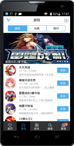 騎士手機助手安卓版是一款杰出的致力與破解游戲的Android手機管理軟件,安裝包小巧方便,萬千匯聚,一觸即得,是Android手機的權威資源平臺,擁有最全最好的應用、游戲資源,幫助您在海量資源中精準搜索、高速下載、輕松管理。騎士手機助手獨有的海量大游戲,大破解游戲,集成了數(shù)以萬計的大型破解游戲,無限金幣游戲,以及包含數(shù)據(jù)包的游戲,讓您一鍵下載安裝,免去以往大游戲需要額外下載并拷貝數(shù)據(jù)包的煩惱。V騎士手機助手是廣大游戲愛好者的第一選擇。