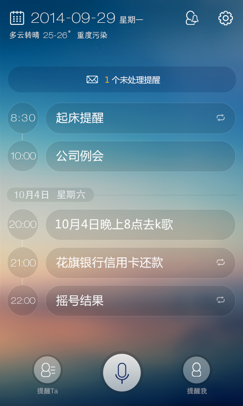 3、『語音』提醒:超霸氣的語音提醒功能,說句話自動(dòng)為你創(chuàng)建提醒。夠cool吧!