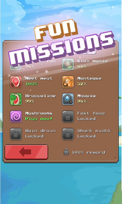 游戲有兩種模式,除了基本的“看你能堅(jiān)持多久不吃肉”模式,游戲還有另一種“生存模式”,每關(guān)都有固定的任務(wù)來完成,比如第一關(guān)就是吃掉所有的水果,第三關(guān)是挑戰(zhàn)好多好多的肉~完成一定程度就能過關(guān),并解鎖下一個(gè)任務(wù),同樣很具有挑戰(zhàn)性。