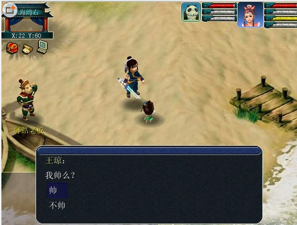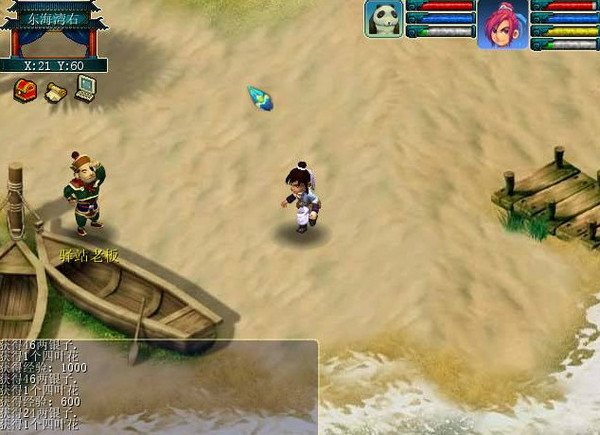 哈哈 正在沉睡中的懷戀 錢小燕怒火中燒的叫醒懷戀 懷戀還不愿起來呢.呵呵,不過還是敵不過女強人,起來吧! 嘻嘻錢小燕還吃醋呢呵呵!一番?;尯?去到建鄴懷戀還像個傻瓜似的到處亂叫,還好小燕提醒他真是的. 找到了寵物仙子嘻嘻不若看他挺可憐的送他一只寵物吧.雙方得到大海龜一只,呵呵! 然后寵物仙子一眨眼功夫不見了果然強大!懷戀和小燕知道老孫頭好像有困難去找下老孫頭吧.和老孫頭對話一番后,去找一個得道的道士.找到牛大膽,他和我是騙子還真像,不知道是不是兩兄弟.然后牛大膽要懷戀和小燕去買只烤鴨給他填肚子.媽的!!牛大膽還真是個小騙子.氣死我也.沒辦法了只有找李善人的管家問問情況了唉! 去到問了下管家又要去抓大海龜了唉真麻煩,去到東海灣小燕在里面繞了半天還沒有一只大海龜.....小燕終于火了.懷戀想用寵物仙子給他的大海龜給管家..還好小燕制止了呵呵!突然有一只小龜走過來,小燕要把他抓住開始大戰(zhàn)一場呵呵!終于抓住了!靠居然不是真海龜是一個人來的到底咋回事!!!!呵呵!原來是傳說中的逍遙生嘻嘻.還以為很帥!一番對話后逍遙和懷戀小燕他們一起去看望李善人.去到后詳細把脈原來李善人得的不是病而是蠱.解蠱后懷戀小燕和逍遙在門外對話.逍遙要回去報告師傅李善人的事情,懷戀和小燕一起去大唐官府拜師學藝.