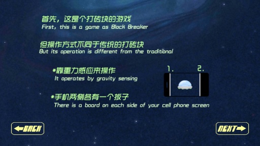 UFO打磚塊游戲的操作玩法與傳統(tǒng)的打磚塊游戲不同,這款游戲是通過靠重力感應(yīng)來操作的,在游戲畫面上左右兩側(cè)各有一個(gè)板子,在游戲時(shí)盡量使手機(jī)與地面保持垂直,你需要知道這個(gè)游戲的世界是和你自身相對(duì)靜止的,然后360度旋轉(zhuǎn)的你的手機(jī)。因?yàn)橛螒蜻^程中是360度旋轉(zhuǎn),所以游戲的有效空間是有限的,有一部分看不到。