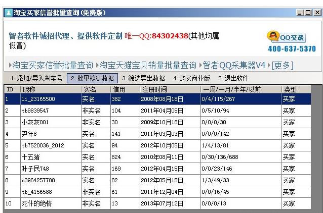 智者淘寶買家信譽(yù)批量查詢是一款簡單實(shí)用的淘寶買家信譽(yù)查詢軟件,可以批量查詢淘寶、天貓的買家最近一周、一月、半年、半年之前的信用點(diǎn)數(shù),以及淘寶號的類型、注冊時(shí)間、是否實(shí)名認(rèn)證等,是賣家必備的工具!