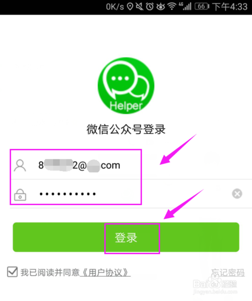 打開手機(jī)安裝的微信公眾號(hào)助手,輸入微信公眾號(hào)的【賬號(hào)】、【密碼】進(jìn)行登錄,如圖。
