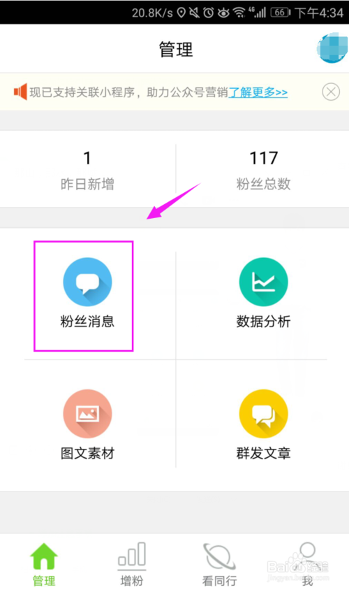 就來到了【管理】界面,點(diǎn)擊【粉絲消息】,如圖。