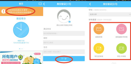 首先上傳/拍攝頭像(必須本人的正面照哦),接下來一次填寫真實(shí)姓名,昵稱和生日。都填好后點(diǎn)擊下一步。然后來到第二頁,如果之前注冊(cè)的時(shí)候?qū)W校信息填錯(cuò)了,這個(gè)時(shí)候還可以改正。一共有四個(gè)認(rèn)證方式供選擇:校園郵箱審核、錄取通知書審核、學(xué)生證審核和學(xué)生卡審核(任選一種就可以啦)!