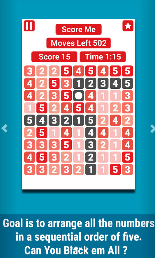 五連移是個(gè)扣人心弦的簡單的免費(fèi)益智游戲。游戲的目標(biāo)是將9乘9的棋盤內(nèi)所有的數(shù)字都以1到5的順序排出來,水平或垂直,順序或倒序均可。【游戲玩法】