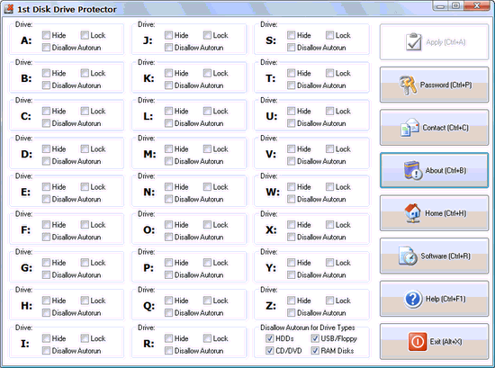 1st Disk Drive Protector V2.30 漢化綠色特別版 1st disk drive protector 能保護(hù)你的計(jì)算機(jī)免受移動(dòng)存儲(chǔ)器濫用的危害,它能設(shè)定用戶(hù)是否可以使用移動(dòng)存儲(chǔ)器或訪問(wèn)本地硬盤(pán)。你不僅可以隱藏、加鎖來(lái)防止本地硬盤(pán)、usb、軟驅(qū)和網(wǎng)絡(luò)的被濫用,還可以禁止自動(dòng)運(yùn)行功能,減少未授權(quán)程序帶來(lái)的風(fēng)險(xiǎn).