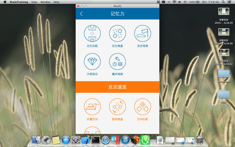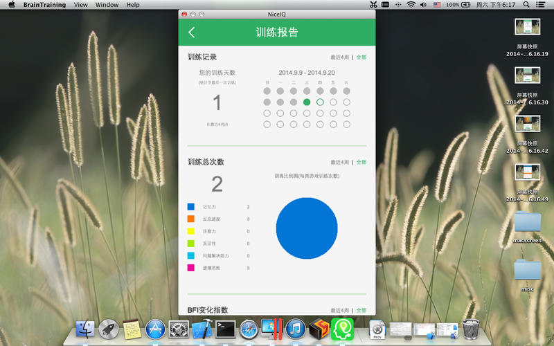 天天益智Mac是一款可以幫助訓(xùn)練大腦思維能力的應(yīng)用軟件,應(yīng)用于Mac平臺(tái)上。這款軟件可以對(duì)你進(jìn)行個(gè)性化的培訓(xùn)計(jì)劃,讓你最需要的能力先培訓(xùn),更好更加的完善自己。這款軟件根據(jù)認(rèn)知科學(xué)最新的研究成果設(shè)計(jì),它能幫助用戶提升記憶力、反應(yīng)速度、注意力、靈活性、問(wèn)題解決能力、邏輯思考能力等一系列增強(qiáng)你腦力的訓(xùn)練科目,按要求訓(xùn)練不但可以全面提升你的腦力,也能改善你的工作生活效率。