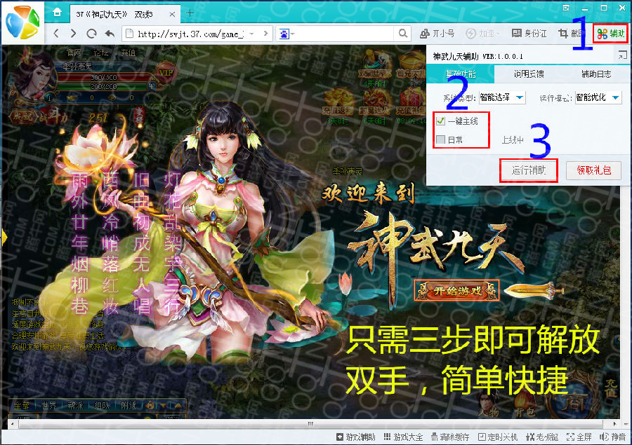 1、打開神武九天323游戲輔助工具(323游戲?yàn)g覽器)2、登陸游戲賬號(hào),進(jìn)入游戲后運(yùn)行輔助工具(選擇主線or日常)即可一鍵式簡單快捷,快開啟您的游戲之旅吧!