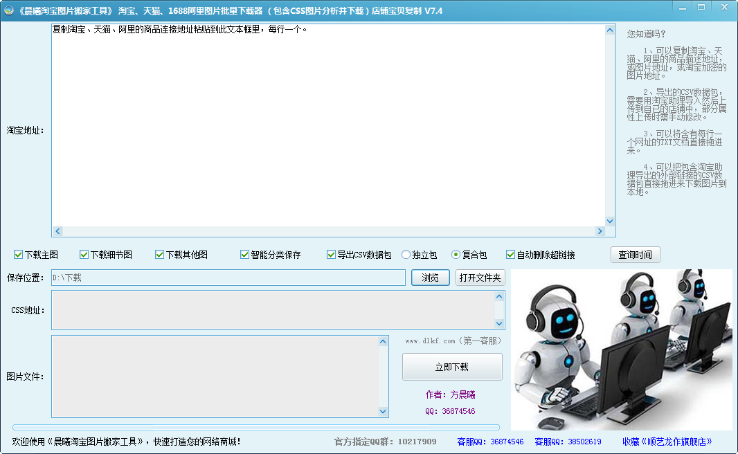 淘寶新店開張最麻煩的就是各種寶貝圖片及信息的上傳工作了,這款晨曦淘寶圖片搬家工具可以方便您上傳商品幫你一一解決。適合新手開店或老店取圖的首選工具,不管是淘寶、天貓還是阿里的圖片,只需輸入任意店鋪的商品連接地址,圖片全部按順序下載好,在也不用為下載圖片而煩惱了。【軟件特點】