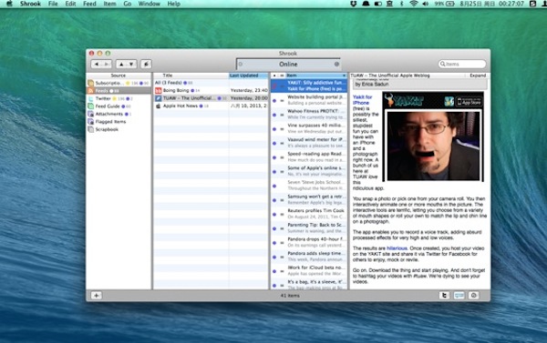 Shrook for mac是一款運行于mac os平臺的mac訂閱工具,Shrook for mac可以添加任意網站的訂閱源,雖然界面設計得有些老舊,但集成了Twitter內容瀏覽和及時的新文章推送功能讓我對她的好感瞬時倍增。