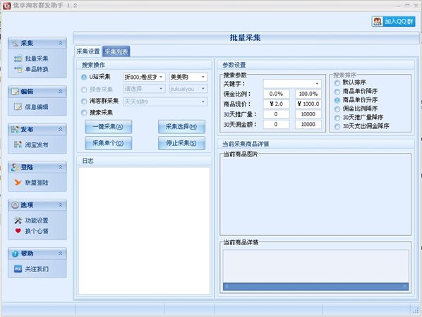 3.淘客群采集:采集阿里媽媽后臺(tái)淘客群(天天9塊9、服飾精品群)內(nèi)商品,支持設(shè)置關(guān)鍵字、傭金比例、商品現(xiàn)價(jià)、30天推廣量、30天傭金額五個(gè)參數(shù),可按系統(tǒng)默認(rèn)、單價(jià)、30推廣量、30天支出傭金進(jìn)行排序采集。