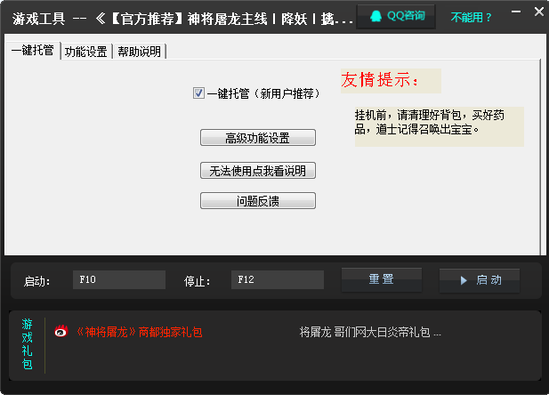 讓游戲變簡單!除喊話和掛機(jī)選項功能以外,請不要改變選項,自動主線,副本,金幣經(jīng)驗任務(wù)等,本輔助功能穿插在主線任務(wù)中,無主線任務(wù)后自動進(jìn)行副本,金幣,經(jīng)驗等其他任務(wù),任務(wù)全部完成后自動進(jìn)行掛機(jī)