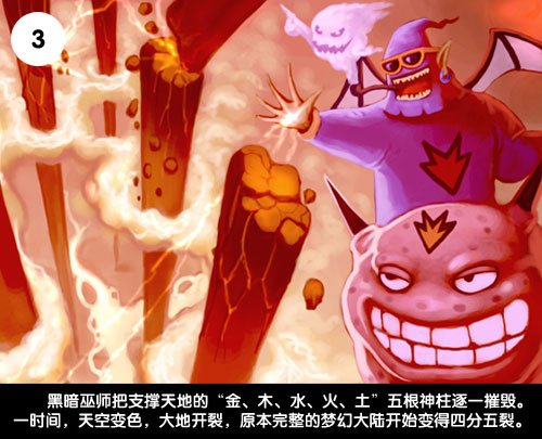 黑暗巫師把支撐天地的“金、木、水、火、土”五根神柱逐一摧毀。一時(shí)間,天空變色,大地開(kāi)裂,原本完整的夢(mèng)幻大陸開(kāi)始變得四分五裂。