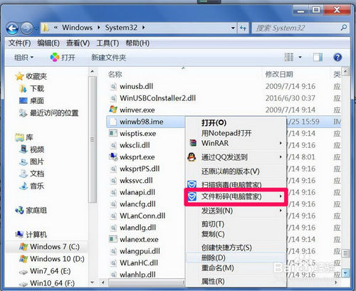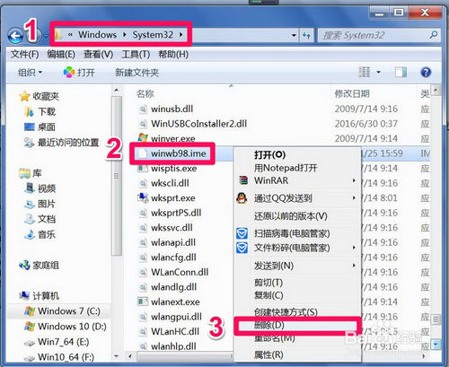 先打開(kāi)磁盤(pán)路徑C:\Windows\System32,找到“winwb98.ime”(這個(gè)文件名稱(chēng)根據(jù)版本不同進(jìn)行選擇),右鍵,將其刪除。